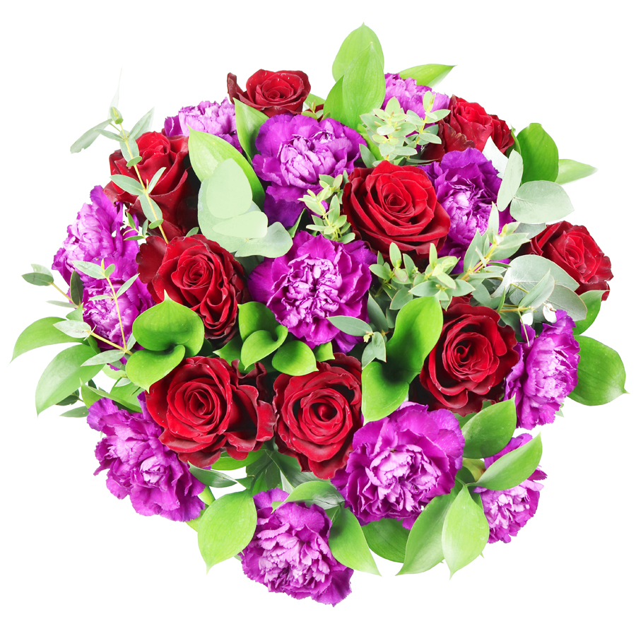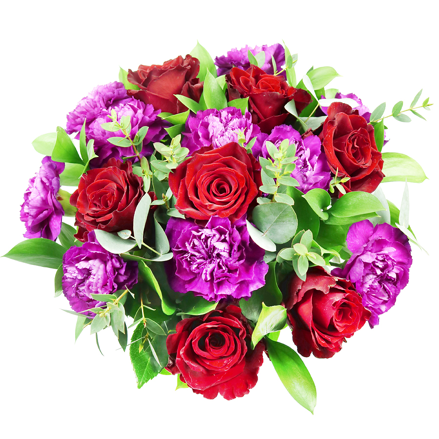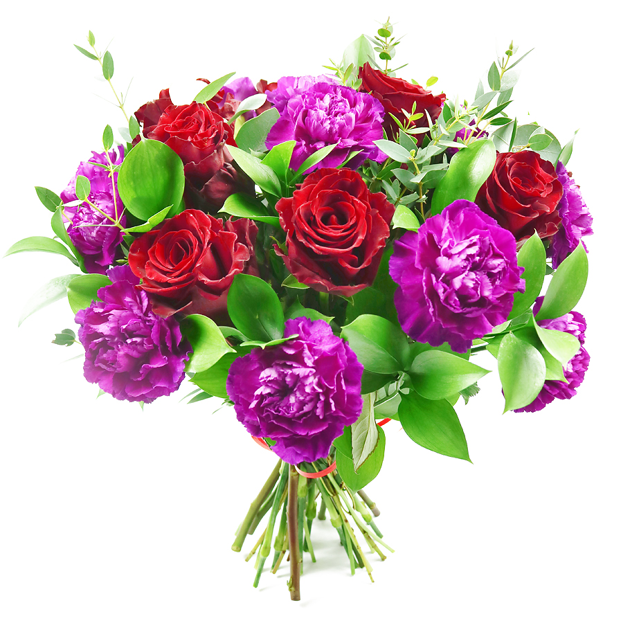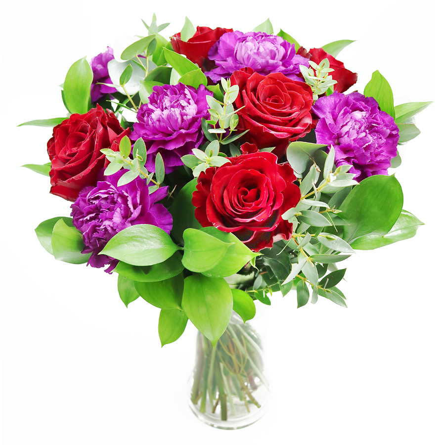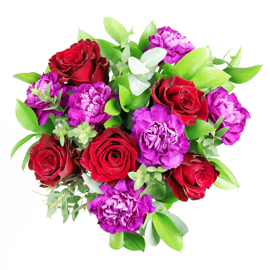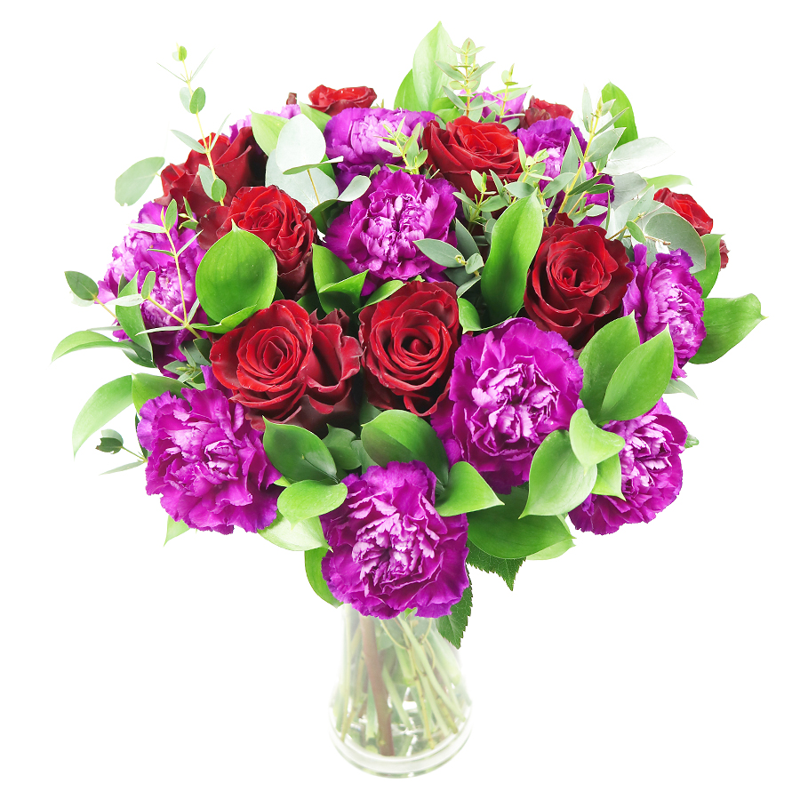 Celebrate your special moments with our Charming Red Rose & Carnation Bouquet. This delightful arrangement features passionate red roses, vibrant cerise carnations, fresh ruscus, and soothing eucalyptus, all carefully selected for their beauty and freshness.