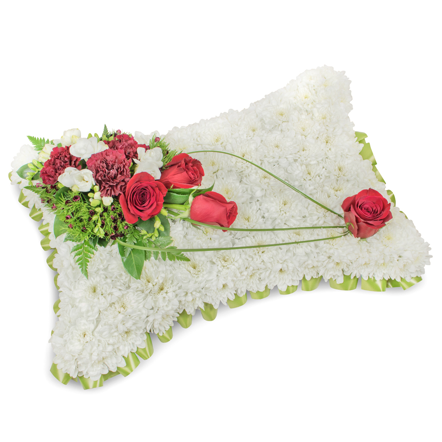 Express your condolences with our graceful condolence flower arrangement, crafted from fresh and hand-selected blooms. This serene bouquet includes white chrysanthemums, red roses, white freesias, and dark red carnations, beautifully complemented by dianthus and bear grass for a harmonious display.