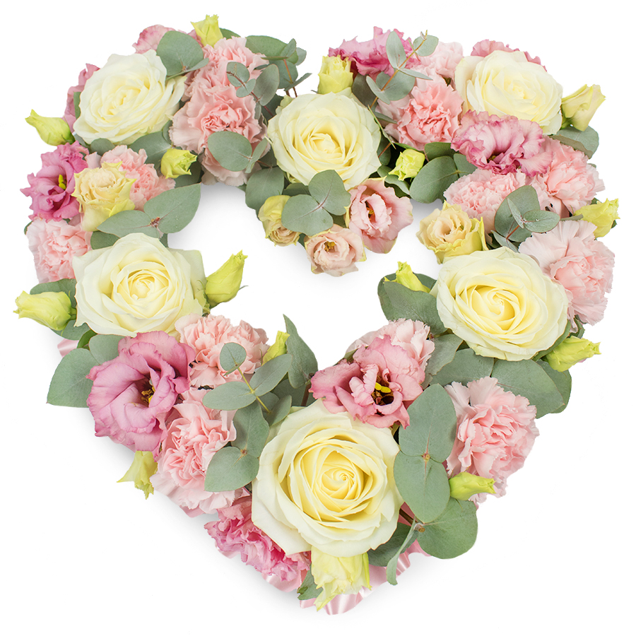 Convey your deepest sympathies with our Serene Open Heart Sympathy Arrangement. This elegant bouquet includes white roses, pink carnations, pink lisianthus, and eucalyptus leaves, all meticulously selected for their freshness and beauty.